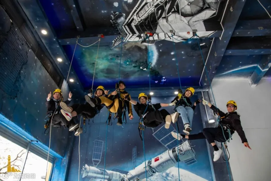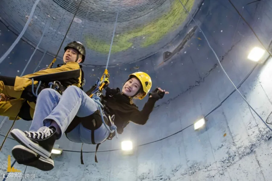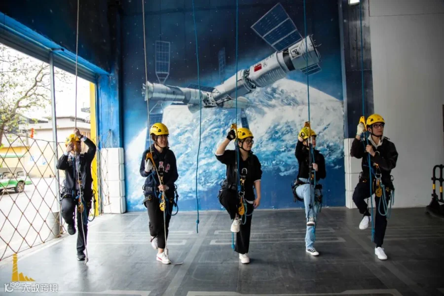 随后,在专业教官的指导下,参观人员在太空馆、灯塔等项目进行了现代绳索运动的体验。