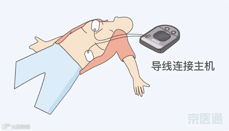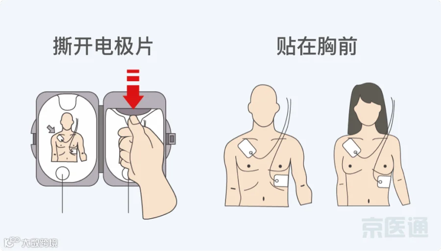 ②贴电极:根据语音提示,解开患者上衣,撕开『电极片』,按照图示贴在患者胸前