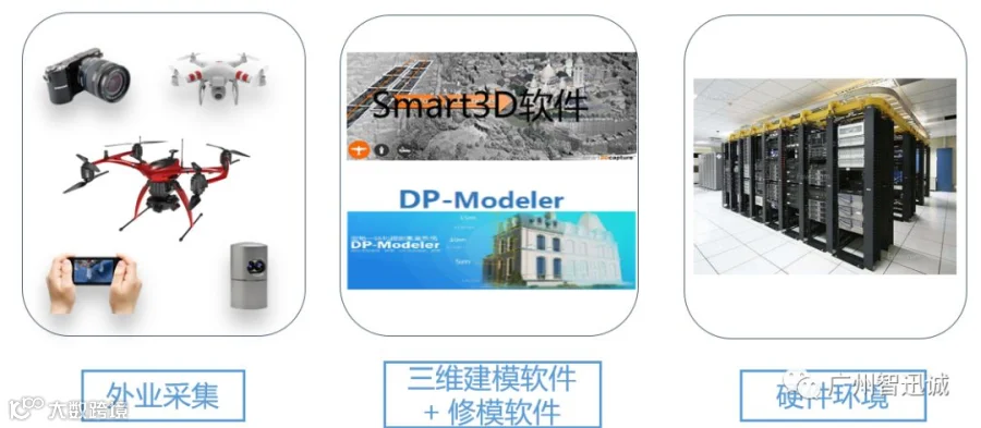 实景三维建模主要生产要素包括影像或点云采集系统、自动建模及修模软件、计算硬件环境三大部分组成。其中外业采集的效率会越来越高,实景三维建模的效率和产能主要由处理计算机的性能和集群数量来决定。