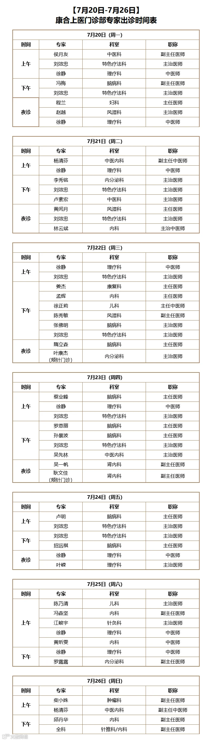 【7月20日-7月26日】康合上医门诊部专家出诊时间表