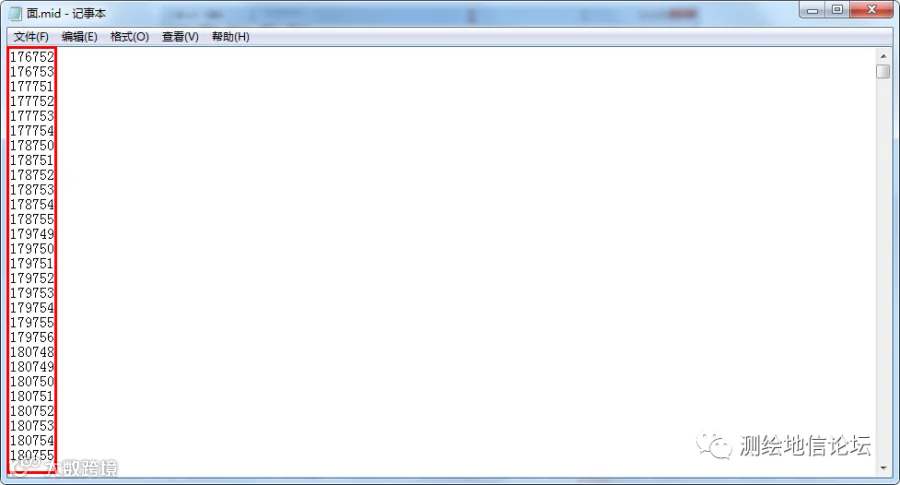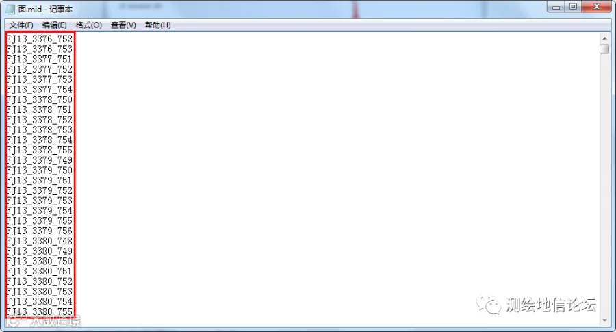 以记事本的方式打开刚刚修改后的“面.mid”文件,可以看到里面是编号(图14),新建一个excel文件,将所有的编号剪切到新建的excel内,Ctrl+F,利用查找和替换功能对编号进行修改。修改规则:将“FJ13_33”替换为1;将FJ13_34替换为2;将“_”替换为空白(即去掉),将替换修改后的编号复制到“面.mid”文件内并保存,替换后的“面.mid”如图15,这样就完成了对编号的修改。