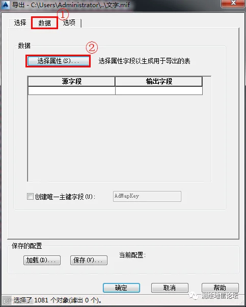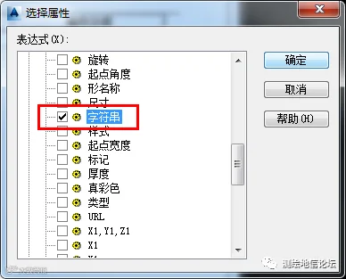 同样的步骤,我们再将文字导出成mif格式的文件,将文件命名为“文字”。这里和导出多段线有点区别,首先是在图9那里,“对象类型”要选择“文字”;设置界面处,我们需要点击“数据”分页,点击“选择属性”(图10),在弹出的“选择属性”对话框中双击“特性”勾选上“字符串”(图11),点击“确定”回到“数据”分页,再次点击“确定”开始输出文字的mif文件。