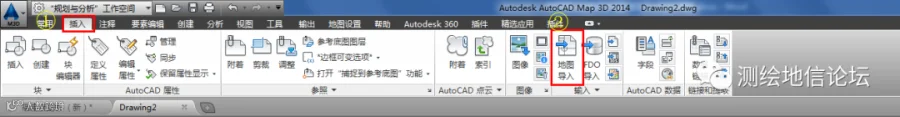 在AutoCAD Map 3D 2014中新增加一个空白图层,在菜单栏点击“插入”,再点击“地图导出”(图16)弹出“导入位置”对话框,点击选择要导入的mif文件(图17),单击“确定”弹出导入设置对话框,在“为导入的每个图层导入特性”一栏找到“数据”一列,点击下面“<无>”旁边的