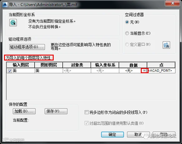 按钮(图18),弹出“属性数据”对话框,选择“创建对象数据”,在“要使用的对象数据表”一栏选择“面”(图19)(如果没有此步骤,导出的shp文件将会没有属性),其余默认,点击“确定”回到导入设置界面,再次点击“确定”,开始导入生成的mif文件。