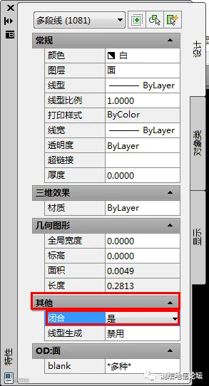 导入完成后可以看到如图20所示的图形,现在正式开始导出shp文件。利用框选的方式将所有的图形框选上,单击右键,选择“特性”,在“特性”对话框内找到“其他”一项,再找到“闭合”一项,将其修改为“是”(图21)(若没有此步骤将不能将多段线围成的图形导出成面),回车确定。