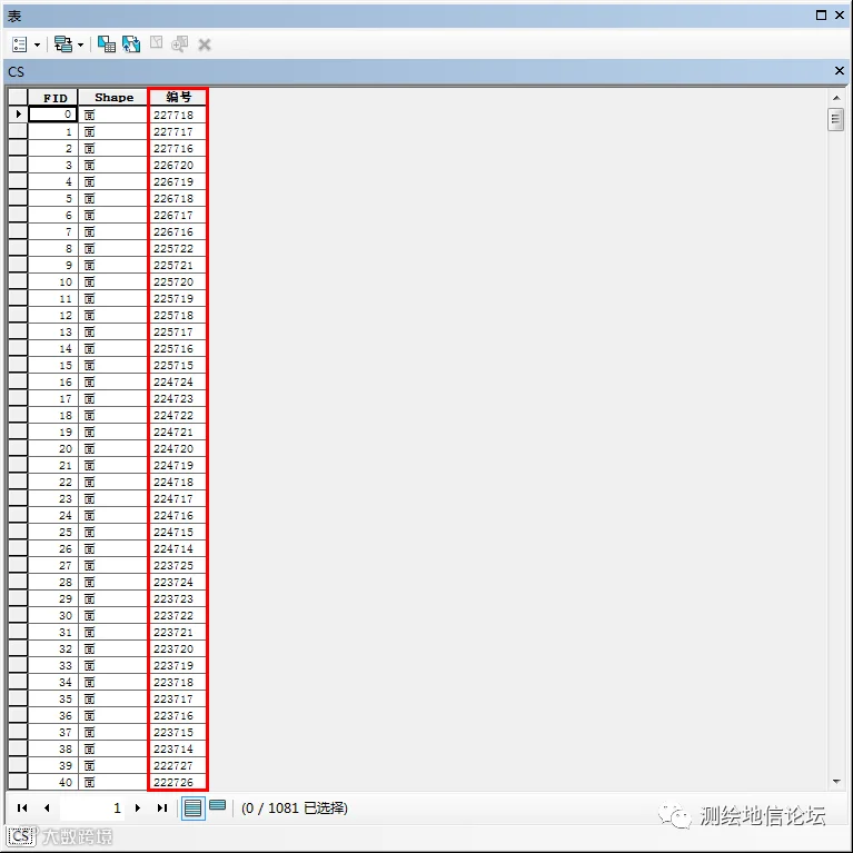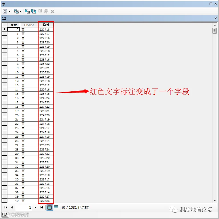 同时,如果我们打开图层的属性表,可以看到属性表中有一行“编号”字段,存储的就是CAD中的红色文字(图3)。