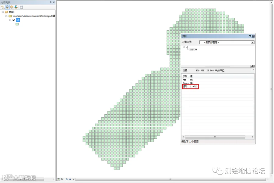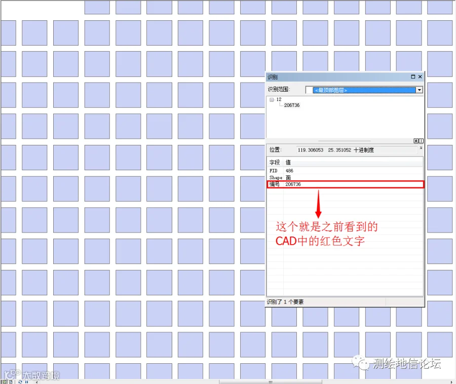 可以看到,之前的CAD线框被转换成了ArcGIS的面,而且用识别工具点一下任意一个面可以识别出他的属性,其中的“编号”一行就是CAD中的红色文字(说明一下:这里看到的和之前的红色文字不一样,是因为在转换的时候对文字进行了修改,后面会说到,如果不修改就是一样的)