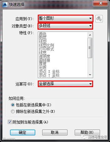 进入“快速选择”界面,在“应用到”一栏选择“整个图形”,“对象类型”选择“多段线”,“特性”不动,“运算符”选择“全部选择”,其余默认(图9)