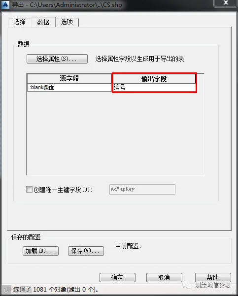 ,同导出mif一样,在下拉菜单中选择“导出”→“其他GIS格式”,在“导出位置”对话框将文件类型修改为shp,这里将导出的文件命名为“CS”,点击“确定”,进入导出设置的对话框。点击“选择”分页,在“对象类型”一栏选择“多边形”(图22);点击“数据”分页,点击“选择属性”按钮,在弹出的“选择属性”对话框中双击“对象属性”,将“面”勾选上(图23)(如果没有此步骤导出的shp文件也会没有属性),单击“确定”回到导出设置界面,在“输出字段”处将其字段名修改为“编号”(图24),这个字段名即为我们之前在ArcGIS内看到的那个字段名;点击“选项”分页,在“其他”一栏勾选上“将封闭多段线视为多边形”(图25)(若没有此步骤将无法将封闭的多边形导出成面),点击“确定”开始导出成shp文件。
