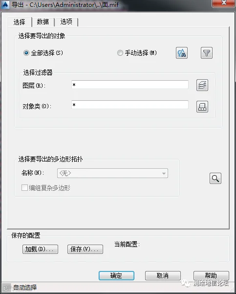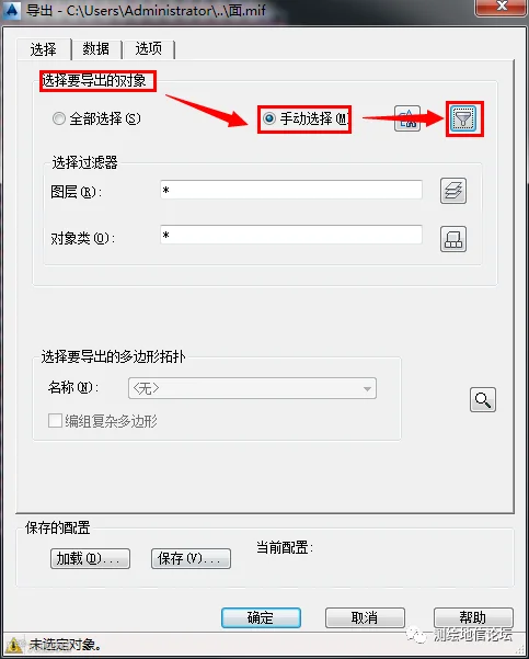 单击“确定”,进入设置界面(图7),这里是导出的关键步骤。点击“选择”,进入“选择”分页在“选择要导出的对象”一栏选择“手动选择”(图8),点击过滤符号