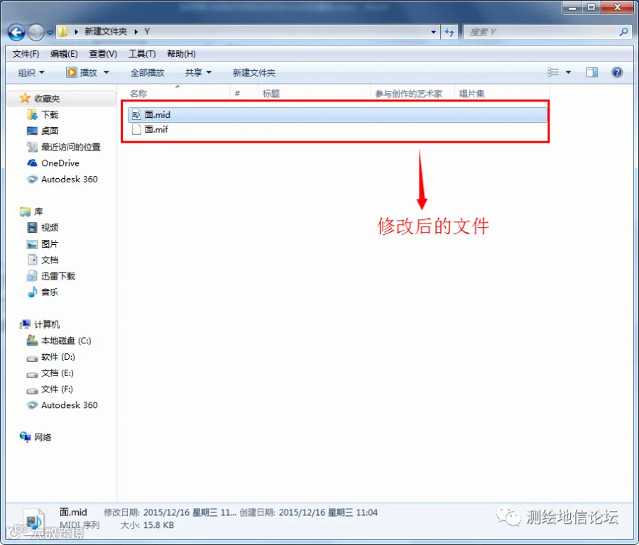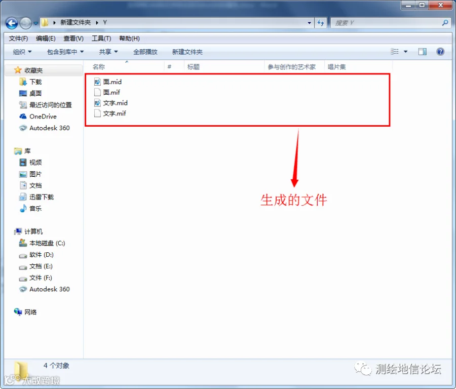 打开输出mif文件的文件夹,我们可以看到里面有四个文件,分别是“面.mif”、 “面.mid”、“文字.mif”和“文字.mid”(图12),这里的*.mif是主体文件,*.mid是属性文件。现在我们将“面.mid”和“文字.mif”文件删除,将“文字.mid”文件重命名为“面.mid”(图13)