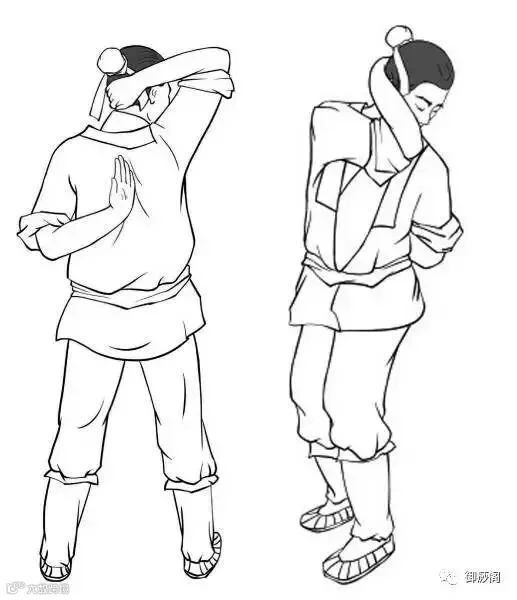 易筋经功法第五式“倒拽九牛尾势”对上肢运动要求“以腰带肩膀,以肩带臂,前手前臂内旋,后手前臂外旋,屈肘内收。