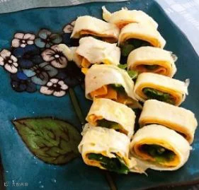 (4)把圆椒条铺一条直线,放在蛋黄饼上,卷成卷;蛋黄卷放在蛋白饼上,再卷成卷。