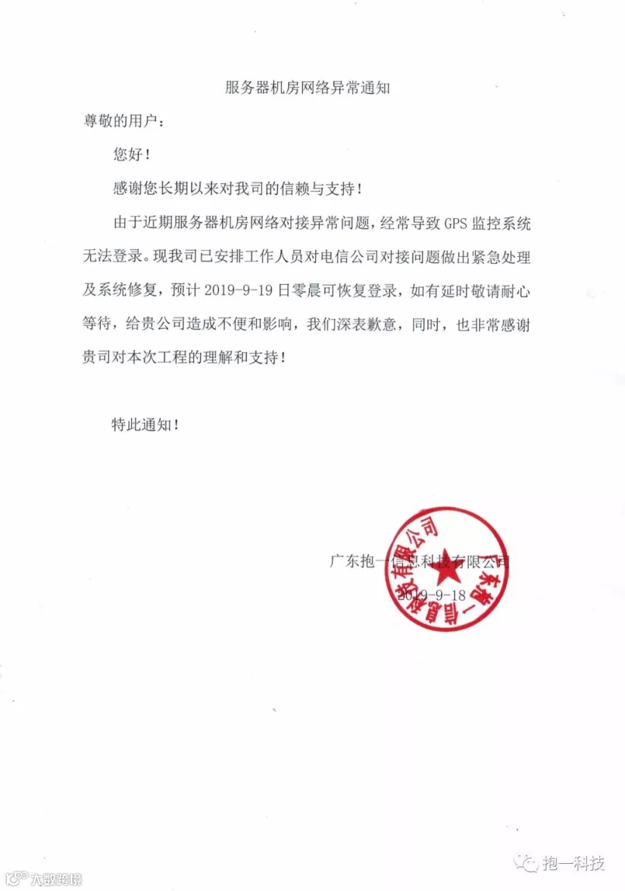 由于近期服务器机房网络对接异常问题,经常导致GPS监控系统无法登录。现我司已安排工作人员对电信公司对接问题做出紧急处理及系统修复,预计2019-9-19日零晨可恢复登录,如有延时敬请耐心等待,给贵公司造成不便和影响,我们深表歉意,同时,也非常感谢贵司对本次工程的理解和支持!