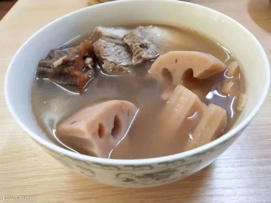 藕,《随息居饮食谱》载:“甘平。生食生津,行瘀止渴,除烦开胃,消食析酲。杀鱼蟹诸毒。熟食补虚,养心生血。开胃舒郁,止泻充饥。”素有“果中灵品”的美誉,煮制后食用具有补虚养血,开胃舒郁的功效。柴鱼,是鳕鱼的干燥制品,晒干后被广东人称为“柴鱼”。广府民间养生智慧认为其具有“健脾胃”、“化痰热”、“益阴血”的功效。莲藕与柴鱼相合,为汤中甘甜味美之“主将”,佐之花生、眉豆开胃健脾除湿,肉味提鲜,陈皮、生姜和中辟腥,熬一碗秋冬时令靓汤。该汤膳能缓解手足不温、心烦失眠、胃纳欠佳、皮肤干燥、肠燥便秘等多种秋冬时节常见不适,适合形体羸瘦女性及大众秋冬保健时食用。
