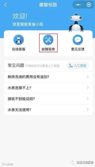 后台报修:点击首页右下方头像选择”客服”,点击【故障保修】