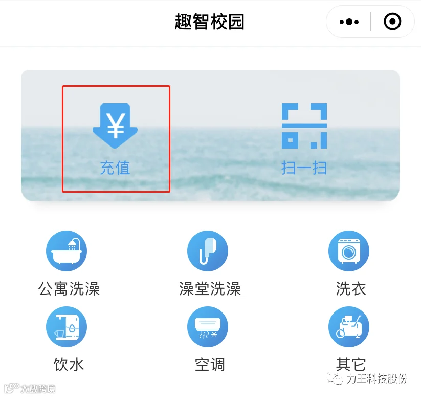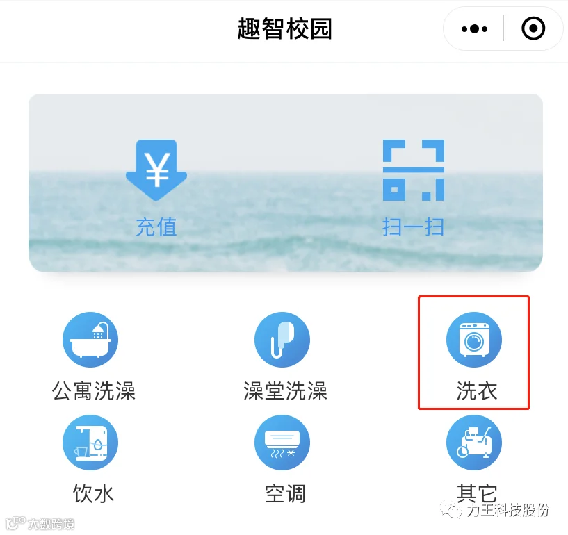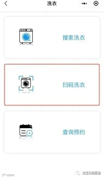 步骤四、充值完成回到首页,点击右上方“ 洗衣“进入选项点击【扫码洗衣】