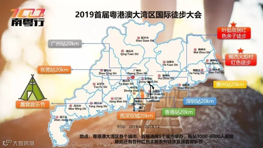 南粤行100公里徒步简介:100公里徒步分为5站举办,每站徒步约20公里。让户外爱好者能在一年的时间里完成100公里的徒步挑战,在这5站外,还会有戈壁雪山沙漠等徒步活动补充;活动地点将在粤港澳各城市的5个地区举行,所选择地区均为美丽乡村与优美环境相结合的地方。每完成一站将获得一枚荣誉奖牌,年度累计完成5个站将获得一个极具纪念意义的百公里奖牌。活动初定计划分别是4月、5月、6月、10月、11月、12月。活动计划以具体公布为准。