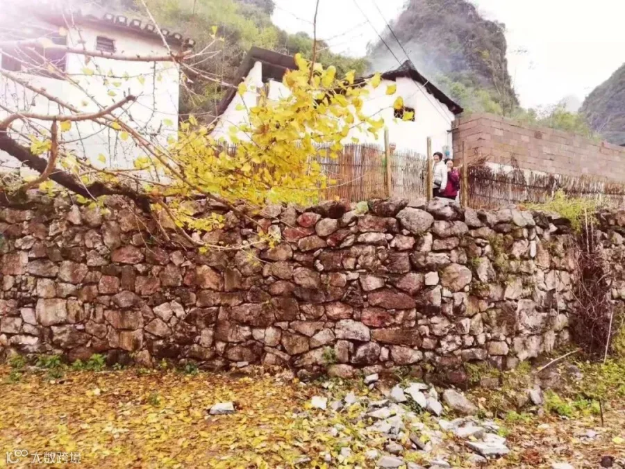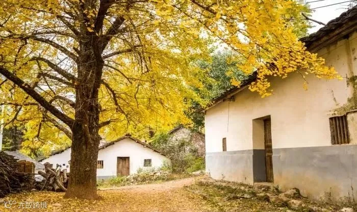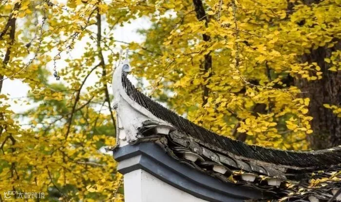 金黄的银杏叶与古老的砖墙黑瓦相映成趣,别具韵味