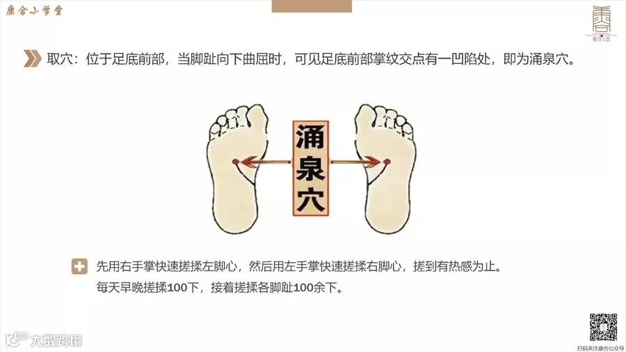 涌泉被称为人体“接地气”的枢纽,按揉可以调节气血睡眠,刺激涌泉穴,有益于补肾壮阳、强筋壮骨。经常坚持搓揉此穴必然会促使手脚冰凉、下肢怕冷的症状改善。