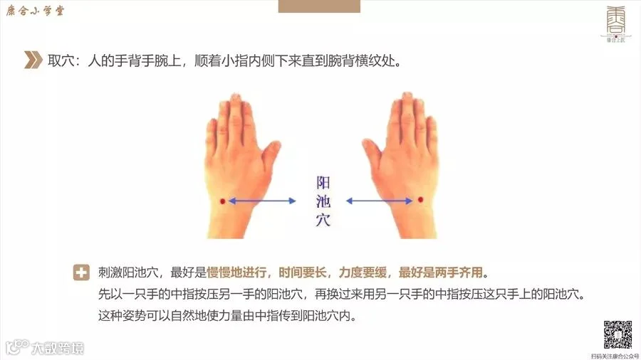 阳池穴(在人的手背手腕上,顺着小指内侧下来直到腕背横纹处)是支配全身血液循环及荷尔蒙分泌的重要穴位。刺激这一穴位,可迅速畅通血液循环,平衡荷尔蒙分泌,暧和身体,进而消除发冷的症状。