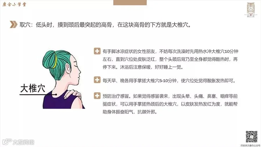 中医认为“大椎通阳”,因为这个穴位是督脉与六条阳经的交汇点,大椎是调节全身怕冷的重要穴位,温灸大椎穴可以通络散寒,这也是缓解全身怕冷的重要方法。