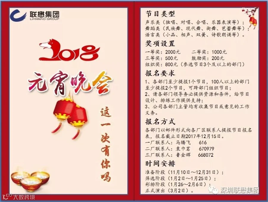 元宵节是中国传统节日之一,是春节之后的第一个重要节日,也是我们联懋人每年一次欢聚一堂的时刻。为弘扬民族传统文化,丰富公司员工文化生活,增强公司员工凝聚力和向心力。公司决定,于2018年3月2日举办“2018年元宵晚会暨2017年优秀员工表彰大会”,即2018年开工抽奖;现面向公司全体员工征集晚会节目。