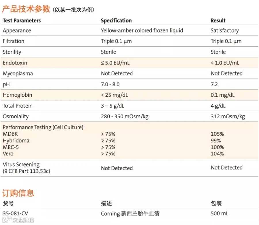 Corning®康宁新西兰胎牛血清(货号:35-081-CV),原料产地为新西兰,新西兰是目前公认的非疯牛病疫区,血源纯净,血清品质可靠。我们采用无菌心脏穿刺取血技术,从血源采集,加工,过滤,包装到质检,遵循行业最高标准,确保最高产品品质!
