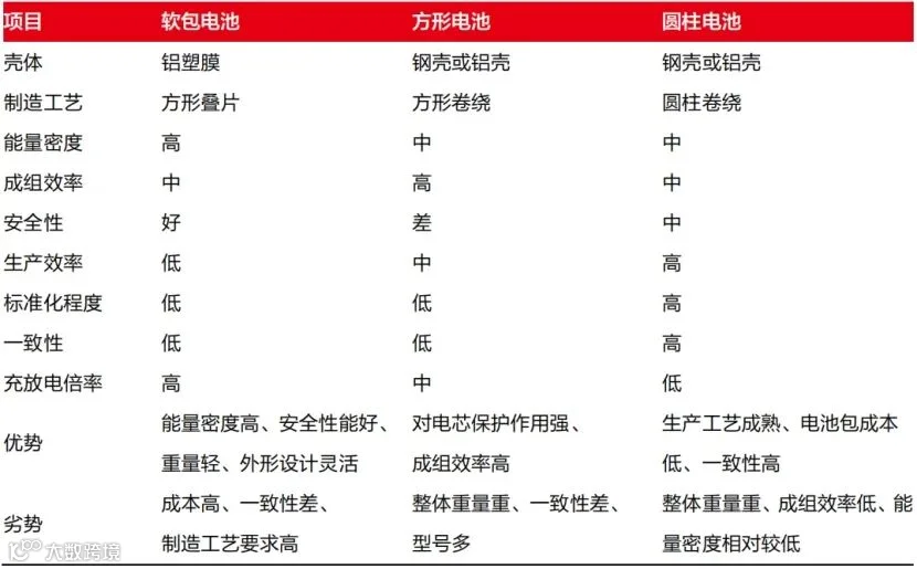 导读:根据不同的封装形式,电池被划分成了圆柱电池、方形电池和软包电池。