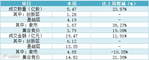 新三板本周累计成交5.47亿股,合计成交19.47亿元,较上周增长11.91%。