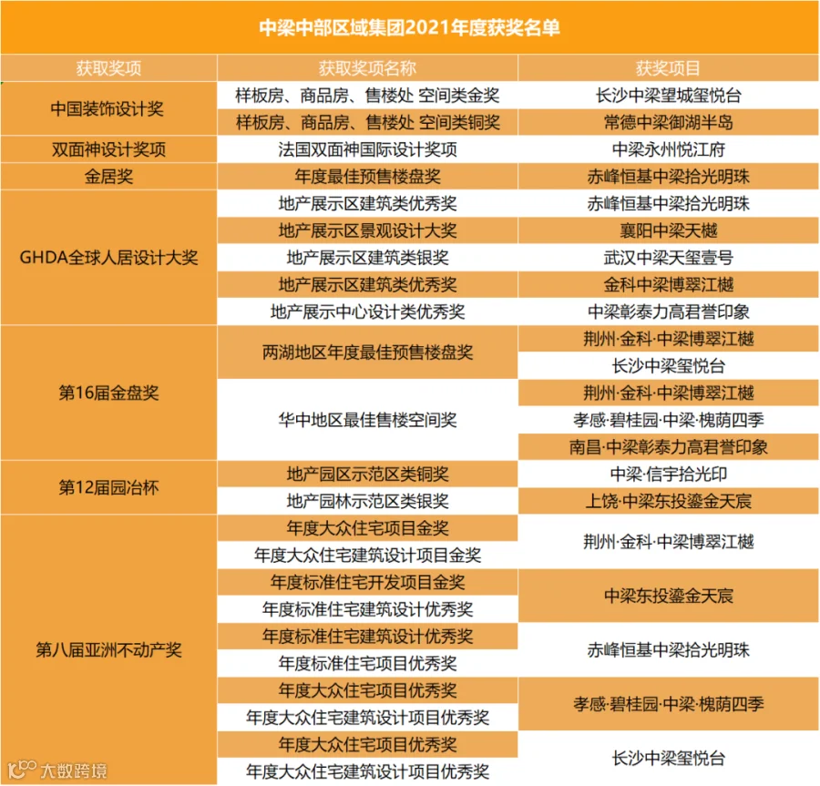在2021年度“中国财经风云榜”现场,中梁凭借长期精研的产品锻造力,荣获“2021年房地产企业优秀产品力榜样”。中梁中部区域集团始终贯彻集团的各项指示,破浪稳行,聚焦深耕区域,精准捕捉客户的喜好和需求,做好产品品质和品牌,坚持行稳致远。梁心筑家、匠心筑梦,中梁中部区域集团不断升级产品口碑,在追求品质的道路上奋勇前进,全年荣获“亚洲不动产”、“金盘奖”等国内外著名奖项26项,获省级观摩&标化&安全文明工地17个、市级14个: