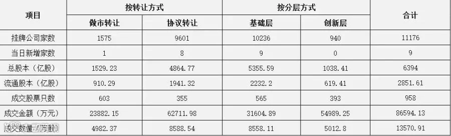 昨日新增挂牌企业9家,挂牌企业总数达到11176家,做市转让1575家,协议转让9601家,待挂牌总家数182只,申报中总家数达到833家。