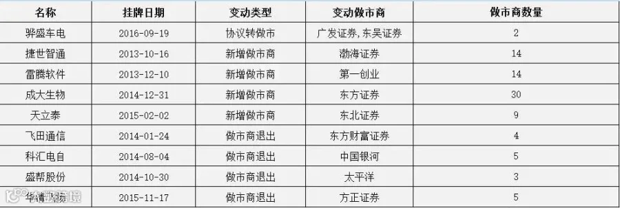 四、做市商变动情况,共有9家企业做市商有所变动,其中1家企业由协议转让转成做市转让,4家企业新增加了做市商,4家企业有部分做市商退出。