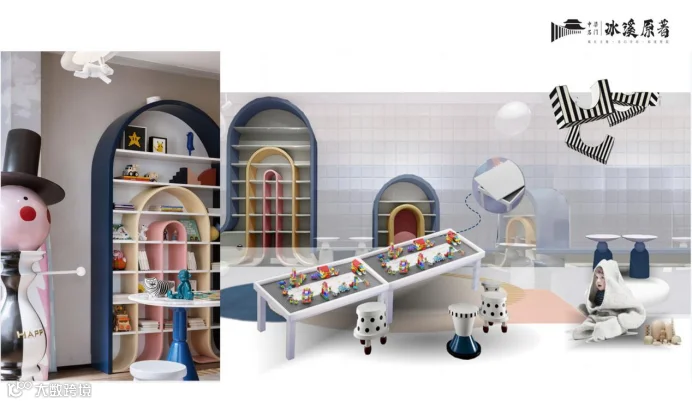 相比较其他空间的东方禅意风格,儿童活动区选取了更加明亮的色彩形成了强烈的对比,形体上卫生间和儿童区借用了西方的‘拱’ 通过构件的小体块链接,释放了西方美学,产生一种强烈的视觉冲击。