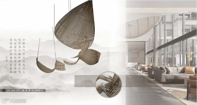 层层天花和灯光的搭配组合,模拟自然天光的效果,将当地丰富的日照资源转化为设计元素引入室内。宛如一本翻开的书籍不仅给人以温润舒适的体验,同时使空间内部的光线得以与建筑外部的自然光相互联动,形成对话,整个空间仿佛在一本书的世界里,装置灯饰两叶轻舟,载着我们在书的海洋中遨游。