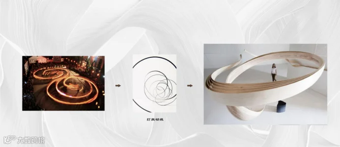 艺术装置吊灯宛如舞动艺术家手上舞动飘带,贯穿整个整个空间的设计打破了人们对坡顶建筑内部抬梁式结构的固式思维,层层递进,宛若交响乐章旋律一般,顺势向上彰显的生命的力量。