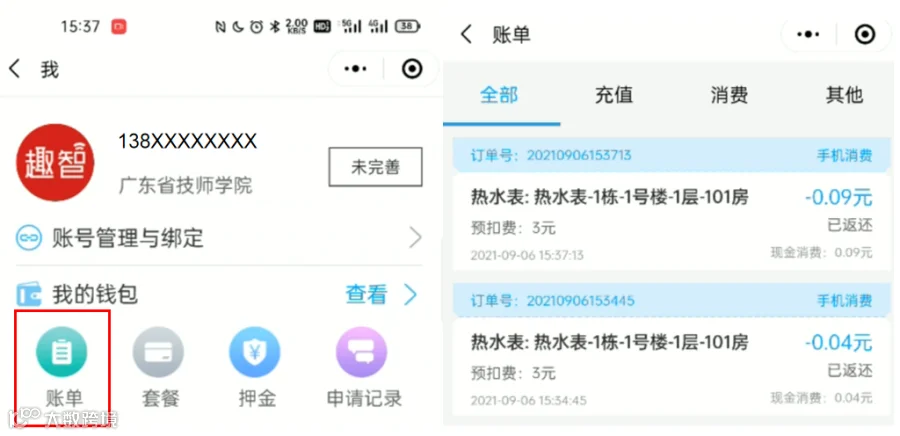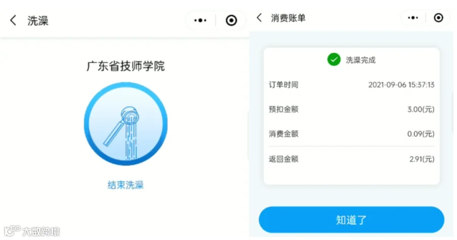 点击结束洗澡,订单完成,生成账单。