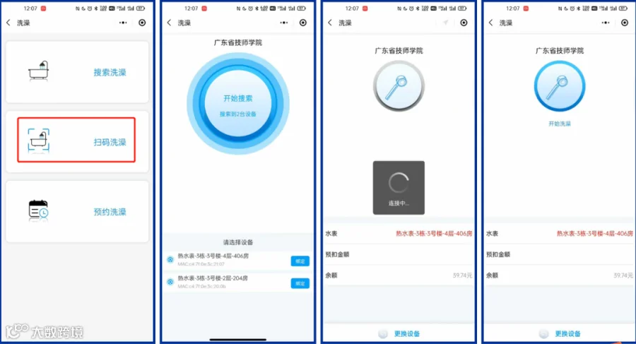 充值完成,搜索设备进行洗澡,连接成功,点击开始洗澡