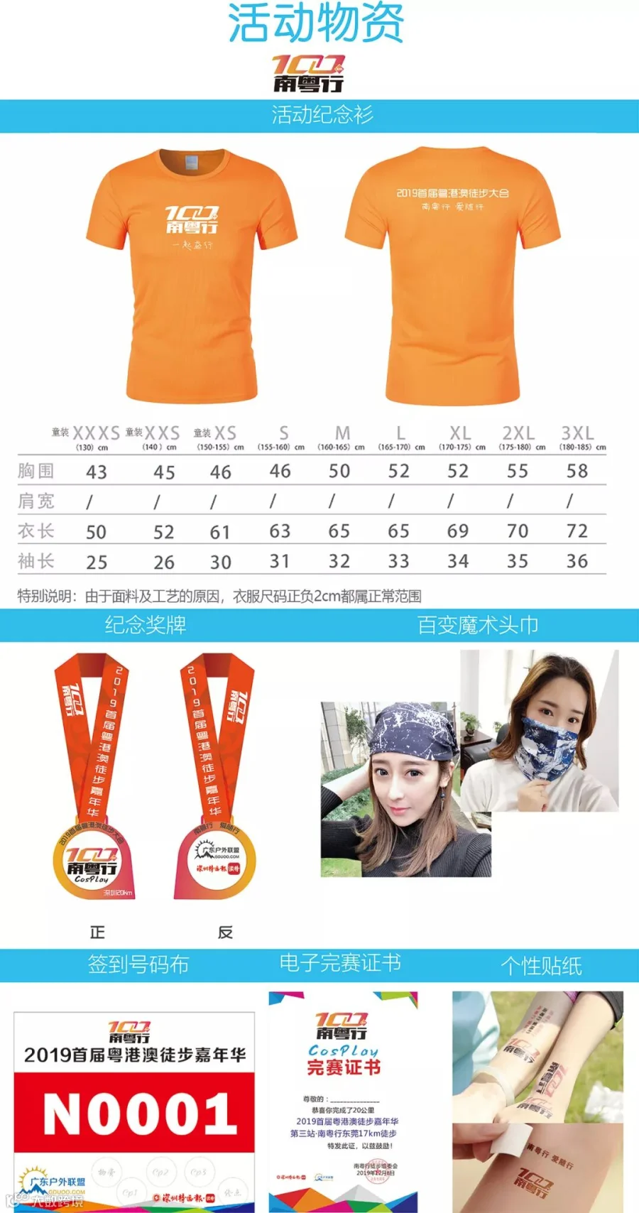 物料>>魔术头巾、号码布、纪念奖牌、水补给等;