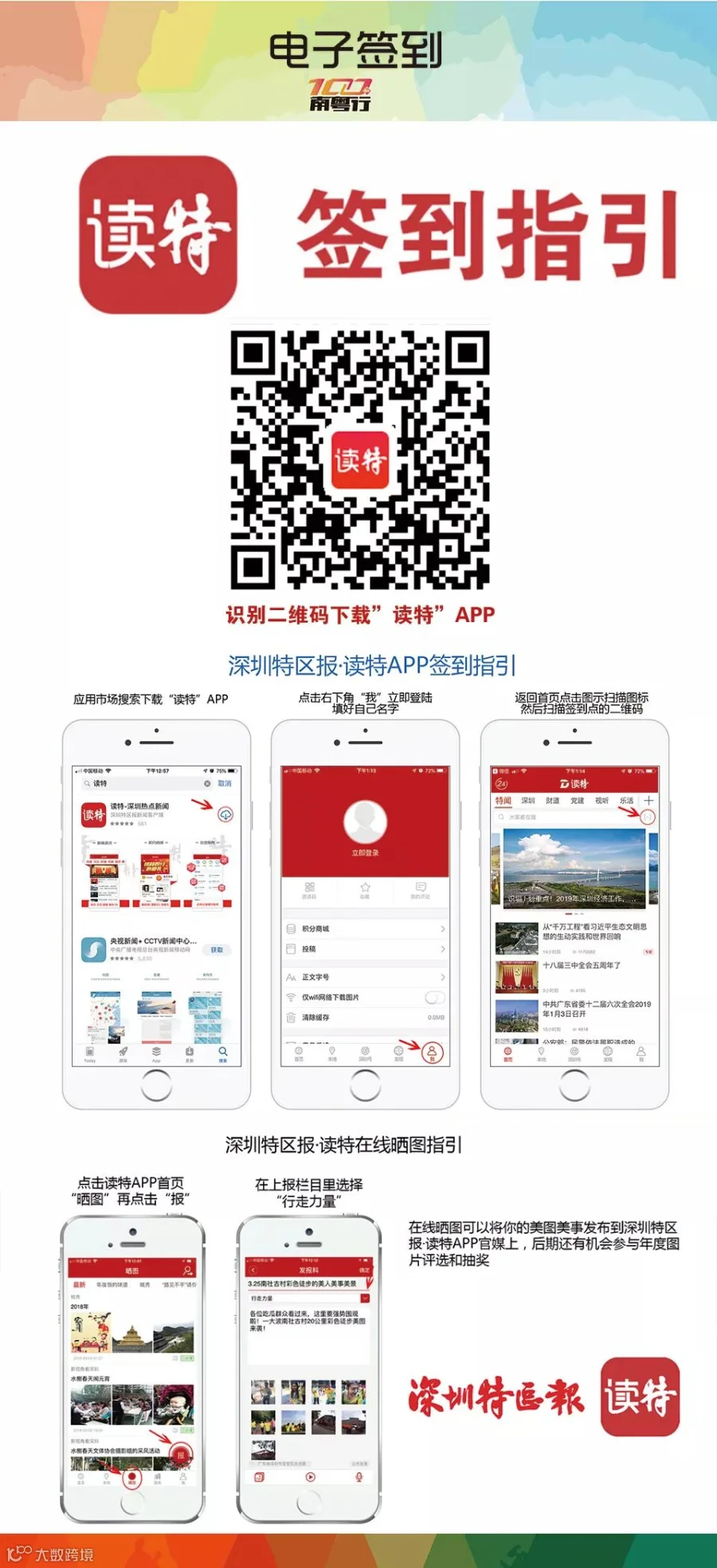 2、南粤行深圳站设立二个签到方式,为打卡护照盖章和深圳特区报·读特APP签到两种方式。
