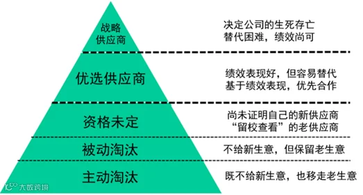 从战略角度来看,主动淘汰相当于“下策攻城”。除了供应风险外,资源投入也是一大挑战。主动淘汰表面上看是一件事,实际上是两件:淘汰一个老供应商,再找一个新供应商。但结果呢只有一个,那就是有个供应商能帮你干这活。两倍的投入,一倍的产出,投资回报太低。所以,即便能够主动淘汰的,采取被动淘汰战略也往往是更好的解决方案。