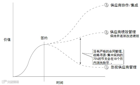 战略寻源结束时,供应商给我们最好的承诺,比如最好的价格、交付和承诺。但很多公司对供应商有选择、没管理,供应商绩效就每况愈下,想法设法地把降的价又升回去了,质量、交付也一日不如一日,就如图中的①。
