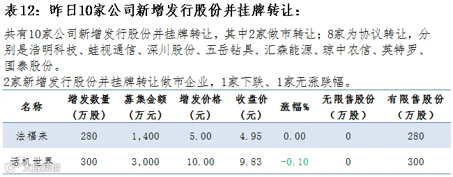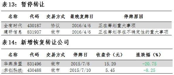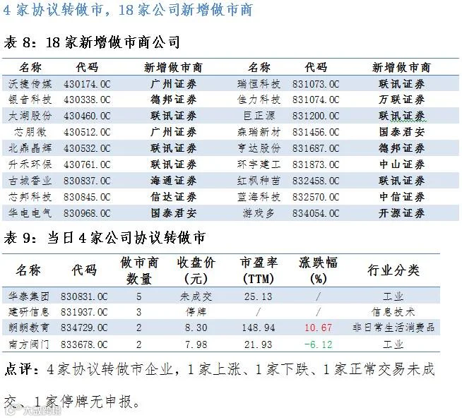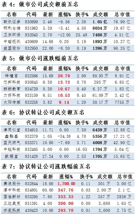 做市企业中有705只个股参与交易,成交额7.39亿元。其中137只个股上涨;11家做市企业成交额破千万,其中联讯证券、明利仓储和卫东环保位列前三位,分别成交1.05亿、8034万元和7480万元。