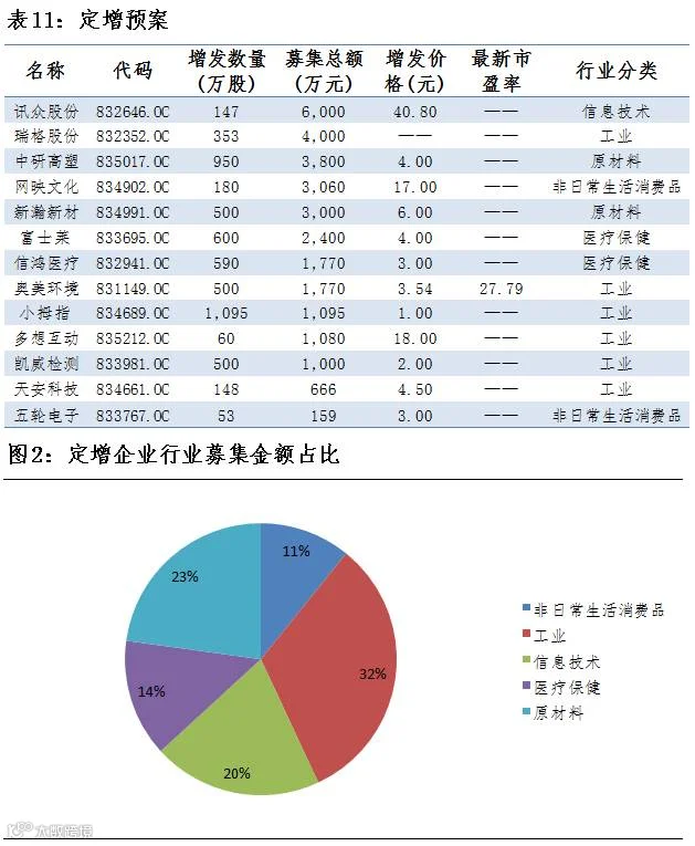 点评:1月6日,共有13家公司公布定增预案,总增发股数5676万股,共募集资金2.98亿元,0家公司募集资金超过1亿元,募集资金最大为讯众股份,募集资金6000万元,总体来看,募集金额主要流向工业行业,占比32%。