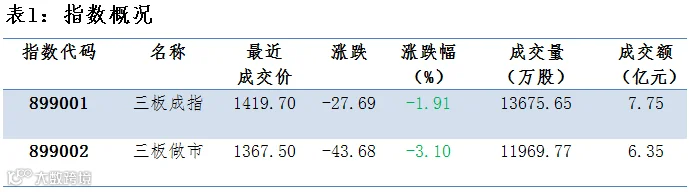 截至7日收盘,三板做市指数报1367.50点,跌43.68点,跌3.10%,创2个月来的新低位,成交额6.35亿元。