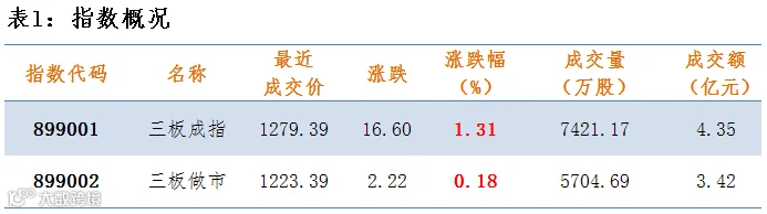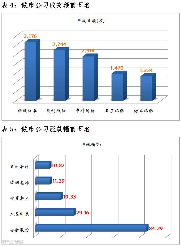 做市企业中有809只个股参与交易,成交额3.71亿元。其中411只个股上涨;7家做市企业成交额破千万,成交额前三名为:联讯证券3175万、明利股份2744万、中科国信2400万。