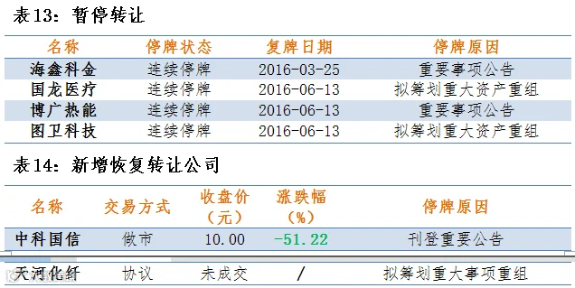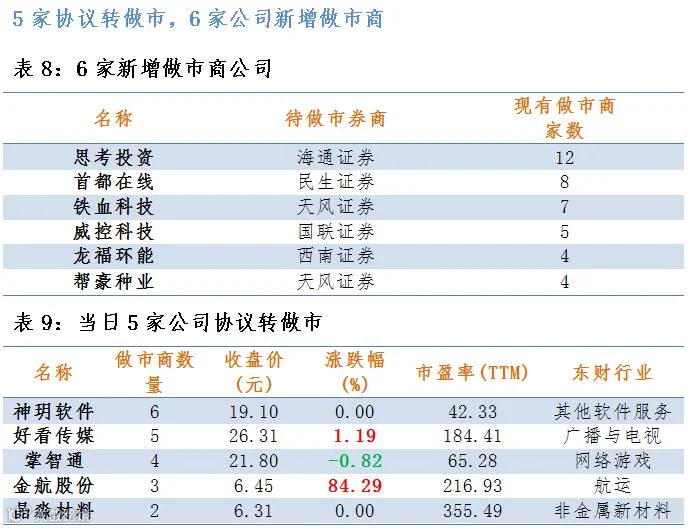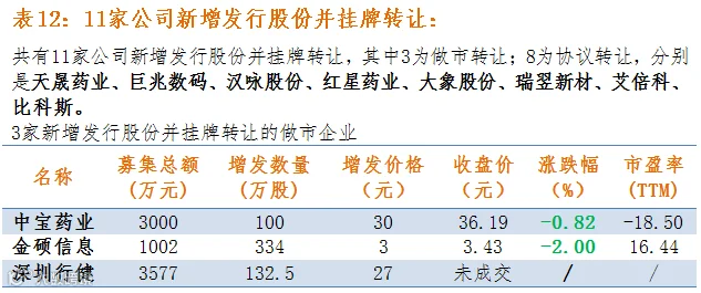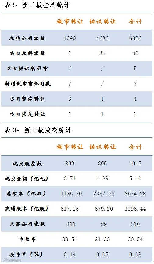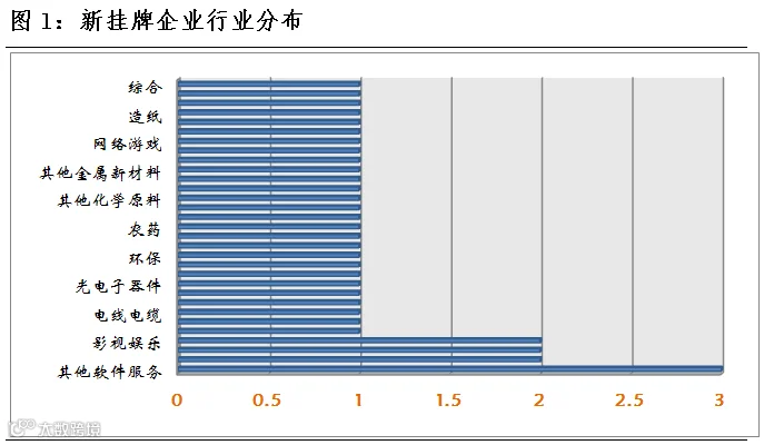 点评:3月14日,共有36家新挂牌公司,其中协议转让公司35家、做市转让公司仅1家。挂牌公司行业分布较分散,相对较多的为其他软件服务、影视娱乐、电子商务、广告营销。