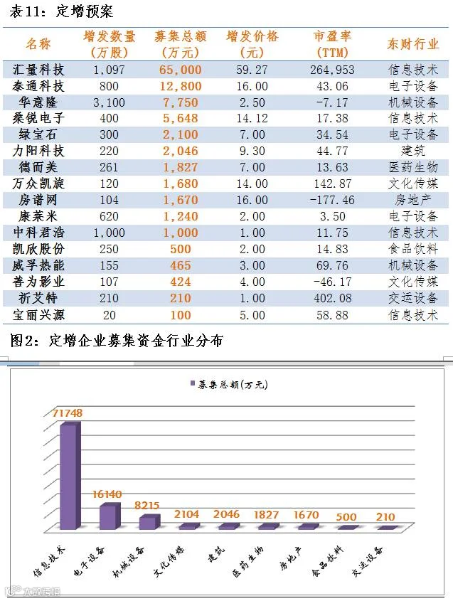 点评:3月11日,共有16家公司公布定增预案,总增发股数8764股,共募集资金10.44亿元。募集资金超过1亿元的有2家,募集资金最大为汇量科技,募集资金6.5亿元,总体来看,募集金额流向信息技术行业较多。
