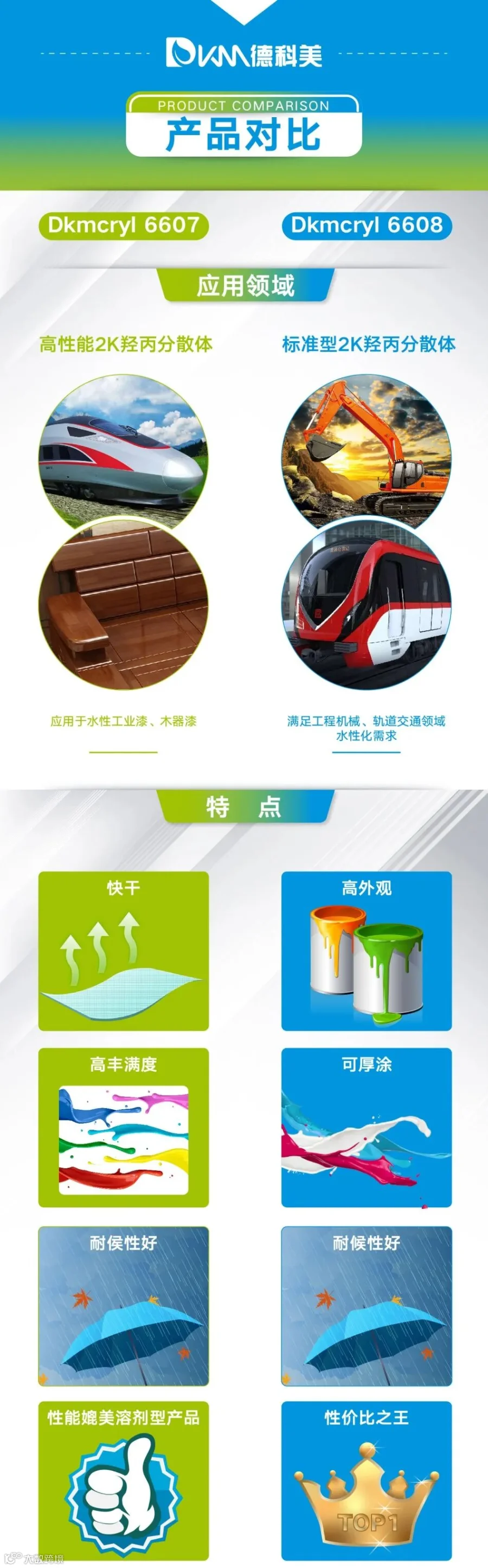 当下,工业涂料水性化如火如荼。工程机械,汽车、机车等行业水性化需求日趋强烈。针对行业需求,德科美既有满足高性能需求Dkmcryl 6607,现又推出了性价比之王Dkmcryl 6608。