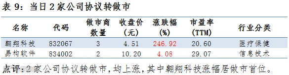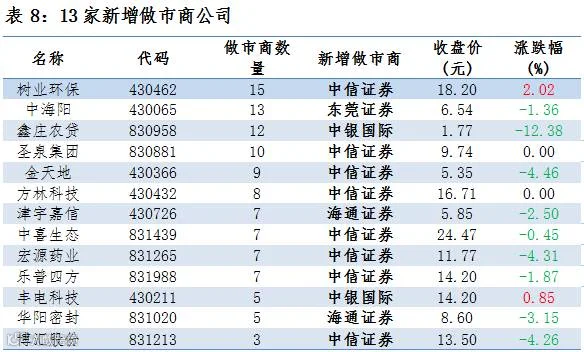 点评:13家新增做市商公司,2家上涨、9家下跌,2家无涨跌幅。